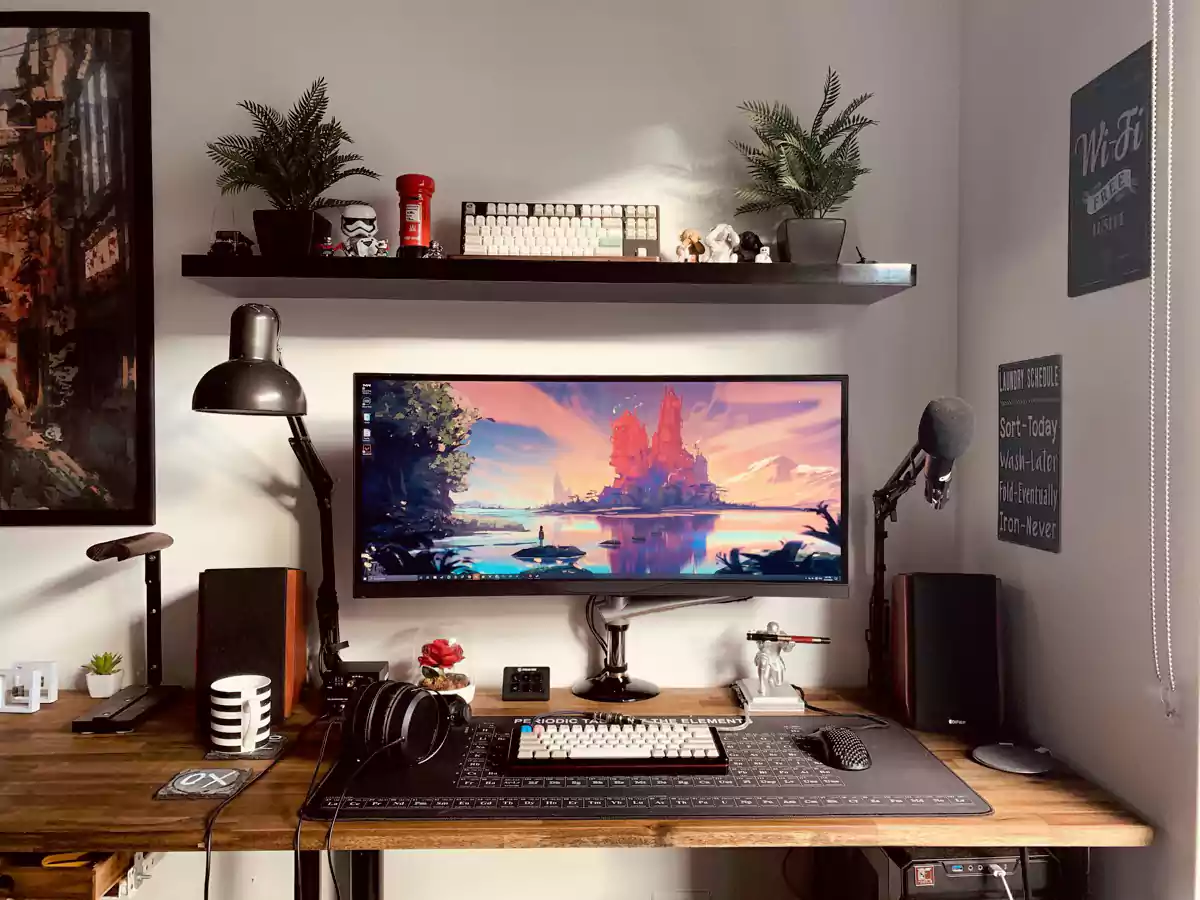 در این طراحی هماهنگ، LED ها با بکگراند دسکتاپ مطابقت دارند، در حالی که یک لامپ زاویه ای برای ارائه نور کار متمرکز در کنار آن قرار دارد. چراغ های رومیزی منحصربفرد زیادی در بازار وجود دارد که با هرکدام از آنها میتوانید محیط گیمینگ خود را منحصر به فرد کنید.