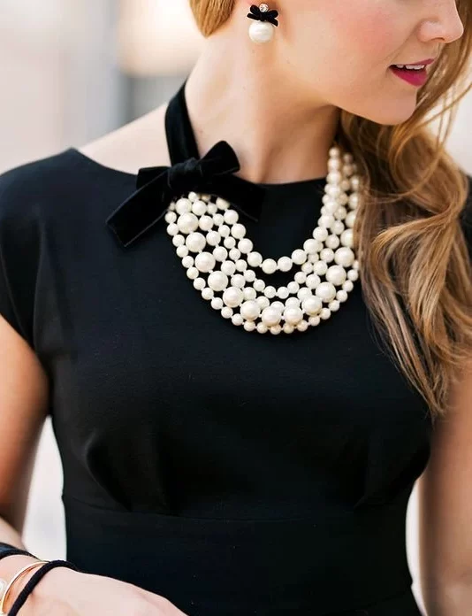 یکی از نمادینترین اکسسوریهایی که با لباس مشکی استفاده میشود و در هر دورهای طرفداران زیادی دارد، مروارید است. حتی اگر الان هم با استایلی شبیه به آدری هپبورن در فیلم صبحانه در تیفانی وارد یک مراسم مهمانی شوید، همهی نگاهها به سمت شما برمیگردد.