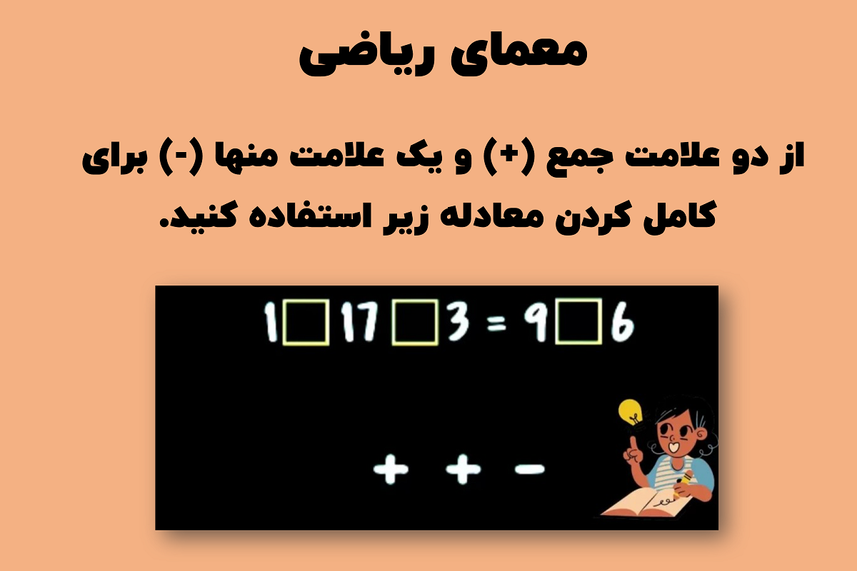 جمع دو عدد ۹ و ۶، ۱۵ میشود. در سوی دیگر معادله، کافیست عدد ۱ را با ۱۷ جمع کرده و عدد ۳ را از جواب که عدد ۱۸ میشود کم کنید تا در این سمت نیز به عدد ۱۵ برسید. آیا از عهده حل این معمای سخت برآمدید؟