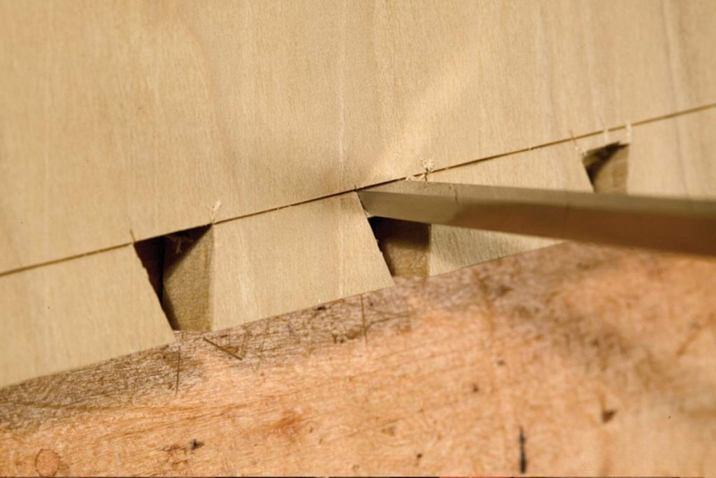 برای حذف قسمت‌های اضافی بین دم‌ها می‌توانید مانند مراحل قبل عمل کنید. بین دم‌ها با اره چند برش بزنید و آنها را تا نیمه از هر سمت تخته مغار بزنید.