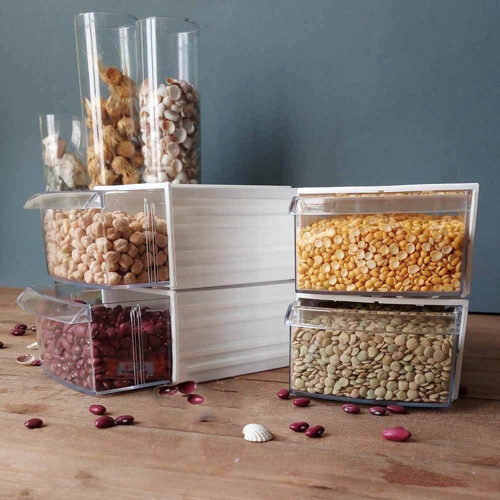 – ظروف شفاف مستطیل: این نوع ظروف، در اندازه های مختلفی قابل تهیه هستند و دارای درب شفافی هستند که اجازه دسترسی آسان به حبوبات را می دهد. همچنین، این ظروف به راحتی در قفسه های کابینت و یا دیوار آشپزخانه قرار می گیرند.