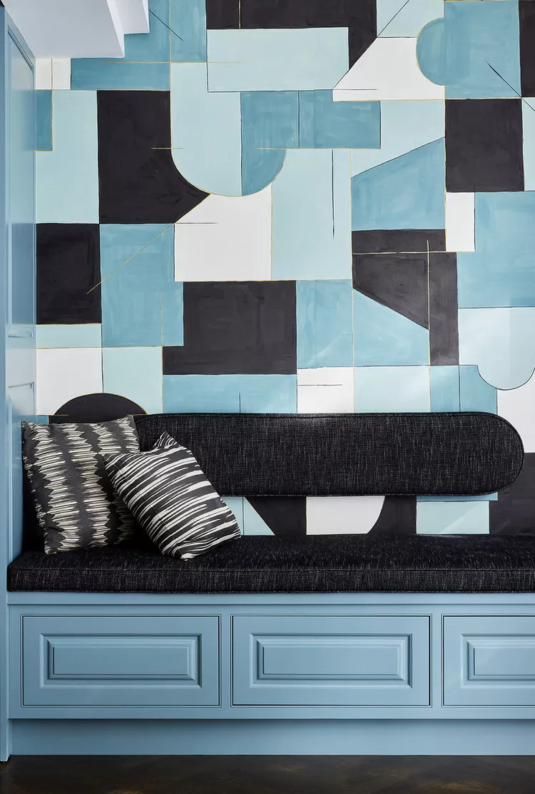 طراحی دیوار برجسته راهی متفکرانه برای وارد کردن شخصیت بیشتر به خانه شما بدون خارج شدن از منطقه راحتی شما است. رنگآبی برای انتخاب رنگ برای یک دیوار برجسته، گزینه ای بی عیب و نقص است. همانطور که این گوشه چشم نواز در این تصویر نشان می دهد. استفاده از کاغذ دیواری هندسی در سایه های مختلف آبی، از روشن تا آبی تیره که با یک نیمکت توکار به هم گره خورده است. یک سایه مکمل رنگ آمیزی شده ایجاد شده است.