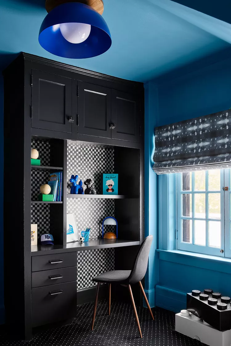 با استفاده از رنگآبی از دیوار تا سقف در هر چهار دیوار، ظاهری منسجم ایجاد کنید. همانطور که طراح داخلی در این اتاق با یک آبی زیبا و اشباع شده برای حداکثر رساندن تأثیرگذاری پیش رفته است. رنگ آمیزی همه قسمت های اتاق ظاهر کامل تری ایجاد کرده و تزئینات و طاقچه های پنجره، قرنیزها، قاب ها، کتابخانه و همچنین پوشش های رادیاتور این اتاق را شگفت انگیز کرده است.