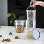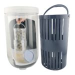این محصول شامل یک ظرف پلاستیکی شفاف، درپوش و سبد داخلی است که امکان جدا کردن مایع و مواد جامد را بهسادگی فراهم میسازد. سبد این محصول دارای دستگیره ای است که بتوان به راحتی سبد را از داخل ظرف بیرون آورد و محتویات آن را مصرف نمود.
