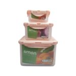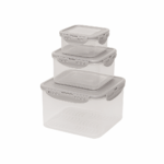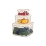ست ظرف نگهدارنده سه تکه شامل: یک عدد ظرف با گنجایش ۳.۷ لیتر و ابعاد ۱۳ × ۱۹ × ۱۹ سانتیمتر. یک عدد ظرف با گنجایش ۱.۲ لیتر و ابعاد ۸ × ۱۴ × ۱۴ سانتیمتر. یک عدد ظرف با گنجایش ۴۲۰ میلی لیتر و ابعاد ۵.۵ ×۱۰.۵ × ۱۰.۵ سانتیمتر