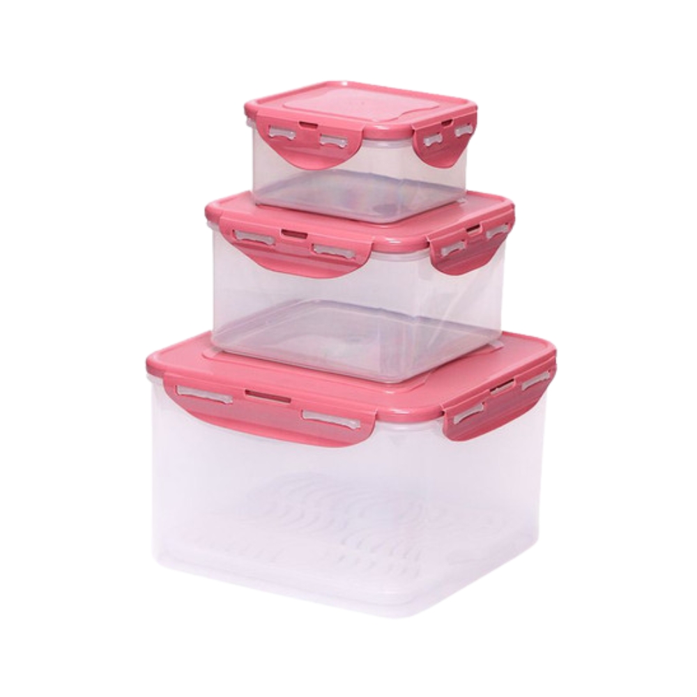 ست ظرف نگهدارنده سه تکه شامل: یک عدد ظرف با گنجایش ۳.۷ لیتر و ابعاد ۱۳ × ۱۹ × ۱۹ سانتیمتر. یک عدد ظرف با گنجایش ۱.۲ لیتر و ابعاد ۸ × ۱۴ × ۱۴ سانتیمتر. یک عدد ظرف با گنجایش ۴۲۰ میلی لیتر و ابعاد ۵.۵ ×۱۰.۵ × ۱۰.۵ سانتیمتر
