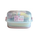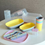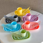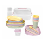یک ظرف نگهدارنده قاشق و چنگال، ۶ عدد لیوان آبخوری، ۶ عدد بشقاب کوچک مستطیلی، ۶ عدد بشقاب بزرگ مستطیلی، ۶ عدد قاشق غذاخوری، ۶ عدد چنگال غذاخوری و ۶ عدد کارد یک سینی مستطیلی، یک عدد آبکش، یک عدد نمکپاش و فلفل پاش. رنگبندی نمکپاش و سینی با دسته و در پک یکسان است.