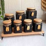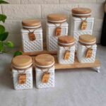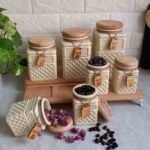 سرویس ادویه و پاسماوری صدفی دارای 3 بانکه بزرگ، 4 بانکه کوچکتر و 2 استند چوبی جداگانه می باشد. این بانکه ها دارای جنسی از شیشه و درب چوبی است. این ست زیبا در رنگ بندی های مختلف تولید می شود که به راحتی می توان با سرویس های آشپزخانه ست کرد.